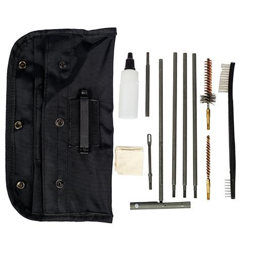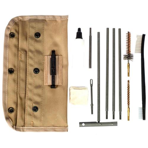 This standard USGI style cleaning kit is for the M16/M4 issue rifle. Rugged nylon pouch, strong snaps and ALICE clip is for easy carry and attachment. The military coated steel rods screw together for several different lengths for cleaning many weapons. You get a Military coated steel T-Handle rod, extensions rods, patch holder, brass bore brush, chamber brush, double ended nylon brush and oil bottle. 5.56/.223 Caliber